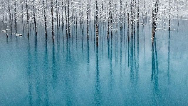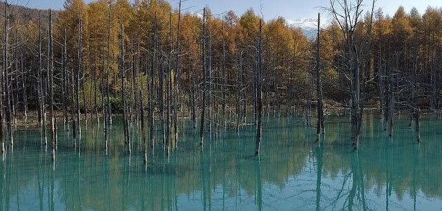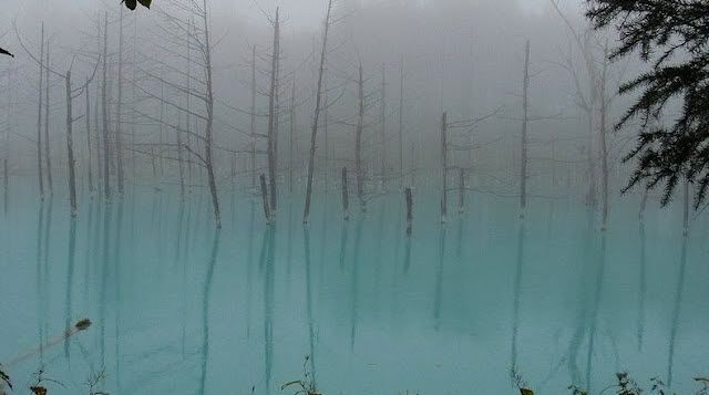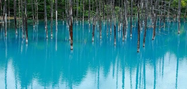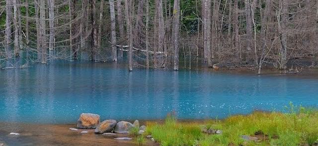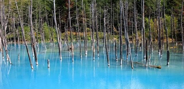 البركة الزرقاء تقع على الضفة اليسرى من نهر بييجاوا جنوب شرق مدينة بيي في هوكايدو ،اليابان وتأخذ البركة إسمها من لونها الأزرق البراق غير الطبيعي مع جزوع الأشجار التي تنمو وسطها وتظهر على سطحها وتعطيها مظهر غاية في الجمال والسحر.
